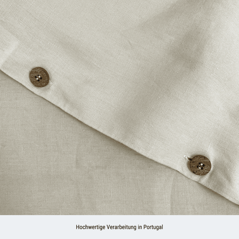 Verschluss: Beim Kissenbezug kannst du zwischen einem offenen Umschlag (Hotelverschluss) oder einem Knopfverschluss wählen. Der Bettdeckenbezug schließt mit natürlichen Kokosnussknöpfen.