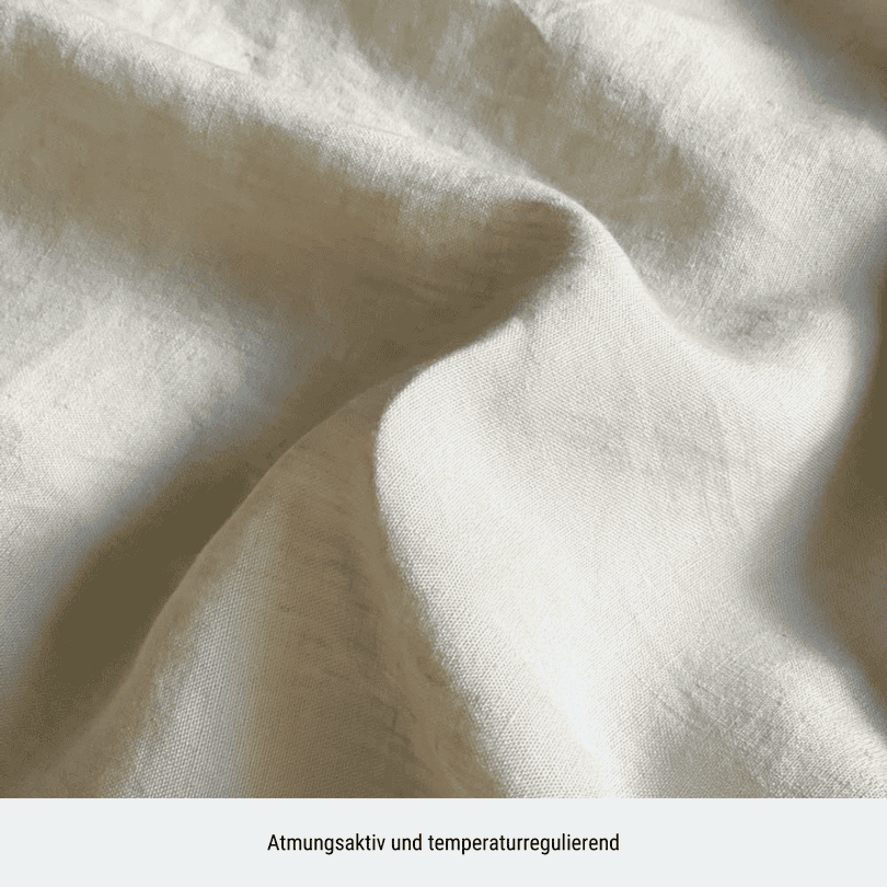 Das atmungsaktive Material sorgt für einen angenehmen und luxuriösen Schlafkomfort, sowohl im Sommer als auch im Winter. Der Bezug lässt sich mit natürlichen Kokosnussknöpfen verschließen und ermöglicht somit eine angenehme Luftzirkulation innerhalb der Decke, wodurch Feuchtigkeit besser absorbiert werden kann. Die Bettwäsche muss nicht gebügelt werden. Der gewollte Knittereffekt bringt den natürlichen und typischen Leinenlook.